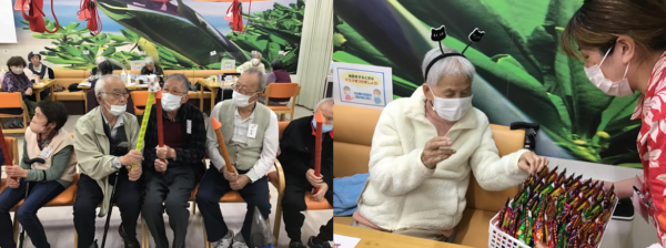 コップ運びゲームをして、おやつにはハロウィンのパッケージのお菓子と折り紙で作成した箱をプレゼントしました。